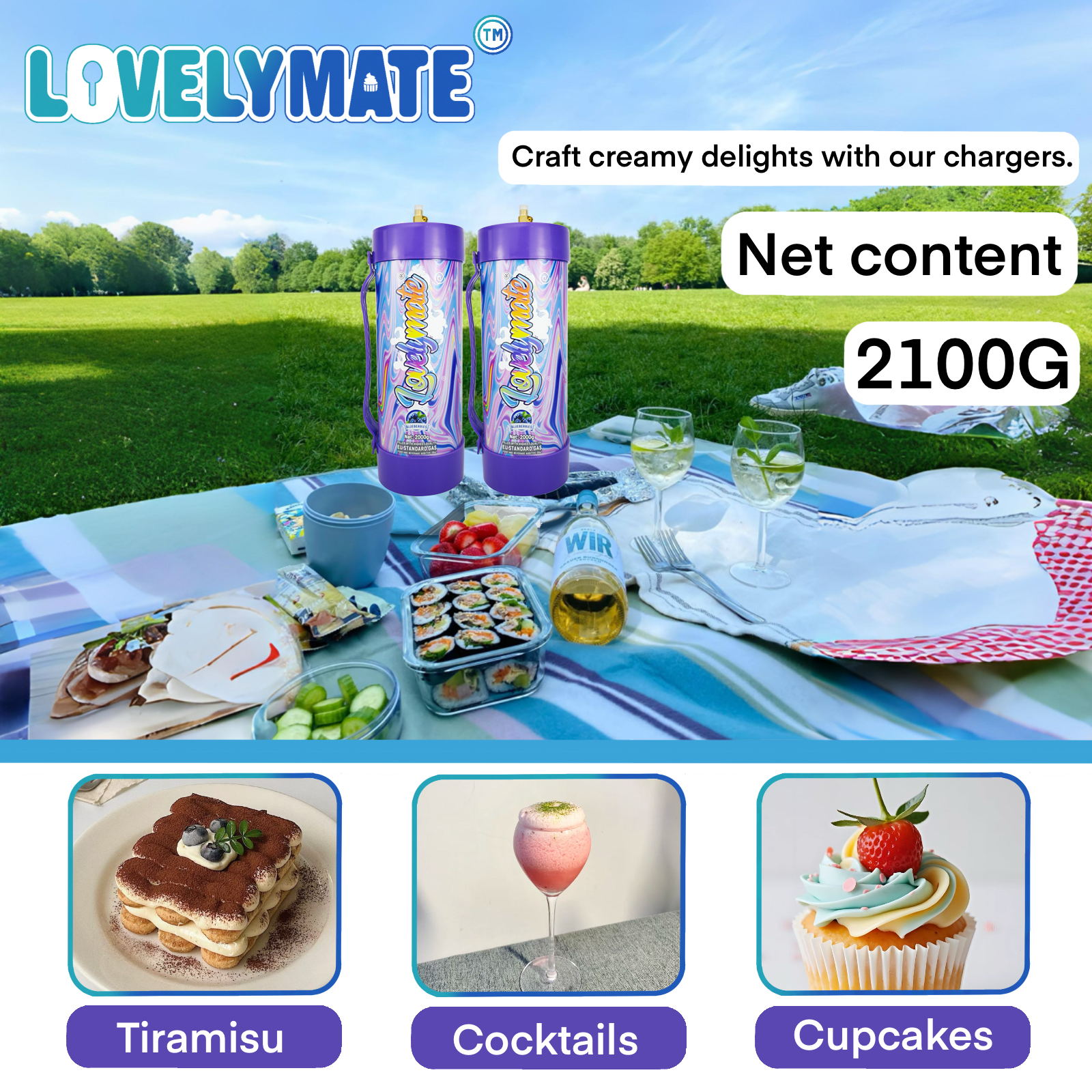 1. Premium Gas: LovelyMate cream charger cylinder contain 2100G gram of Nitrous Oxide which 99% ultra pure, tasteless, and of food grade standard to ensure that it does not affect the flavor of your whipped cream topped desserts and baked goods!