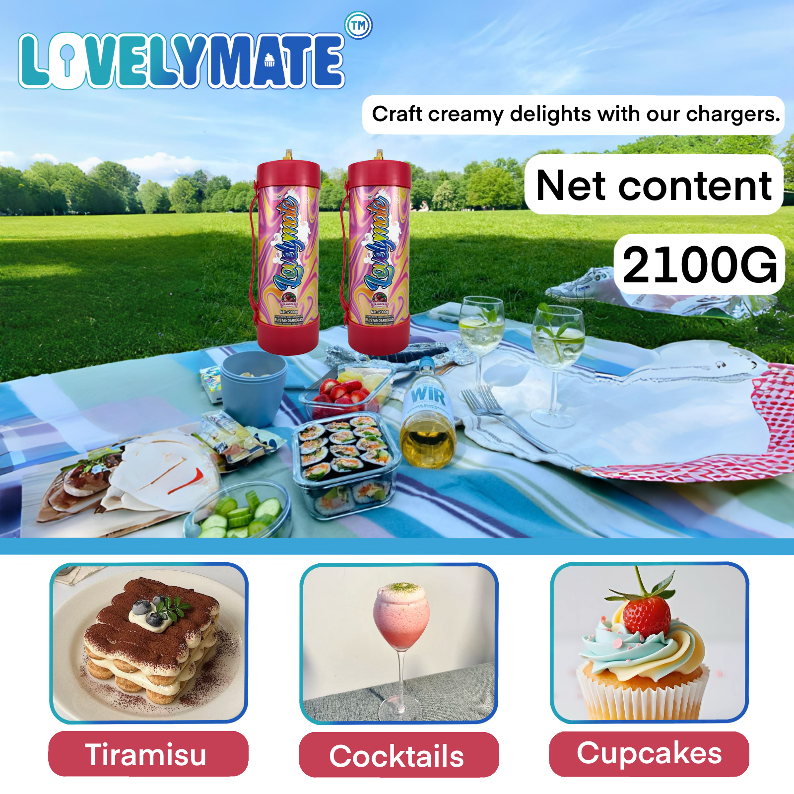 1. Premium Gas: LovelyMate cream charger cylinder contain 2100G gram of Nitrous Oxide which 99% ultra pure, tasteless, and of food grade standard to ensure that it does not affect the flavor of your whipped cream topped desserts and baked goods!